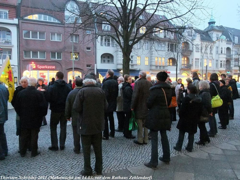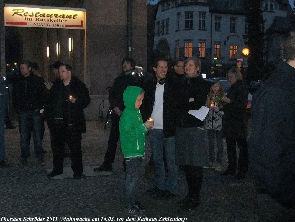 Mahnwache für Japan vor dem Rathaus Zehlendorf am 14.03.2011 (Stichworte: Steglitz-Zehlendorf, Naturschutz, Umweltschutz, Ressourcenschonung, Klimawandel, Fukushima, Gedenken, Atomenergie, GAU)